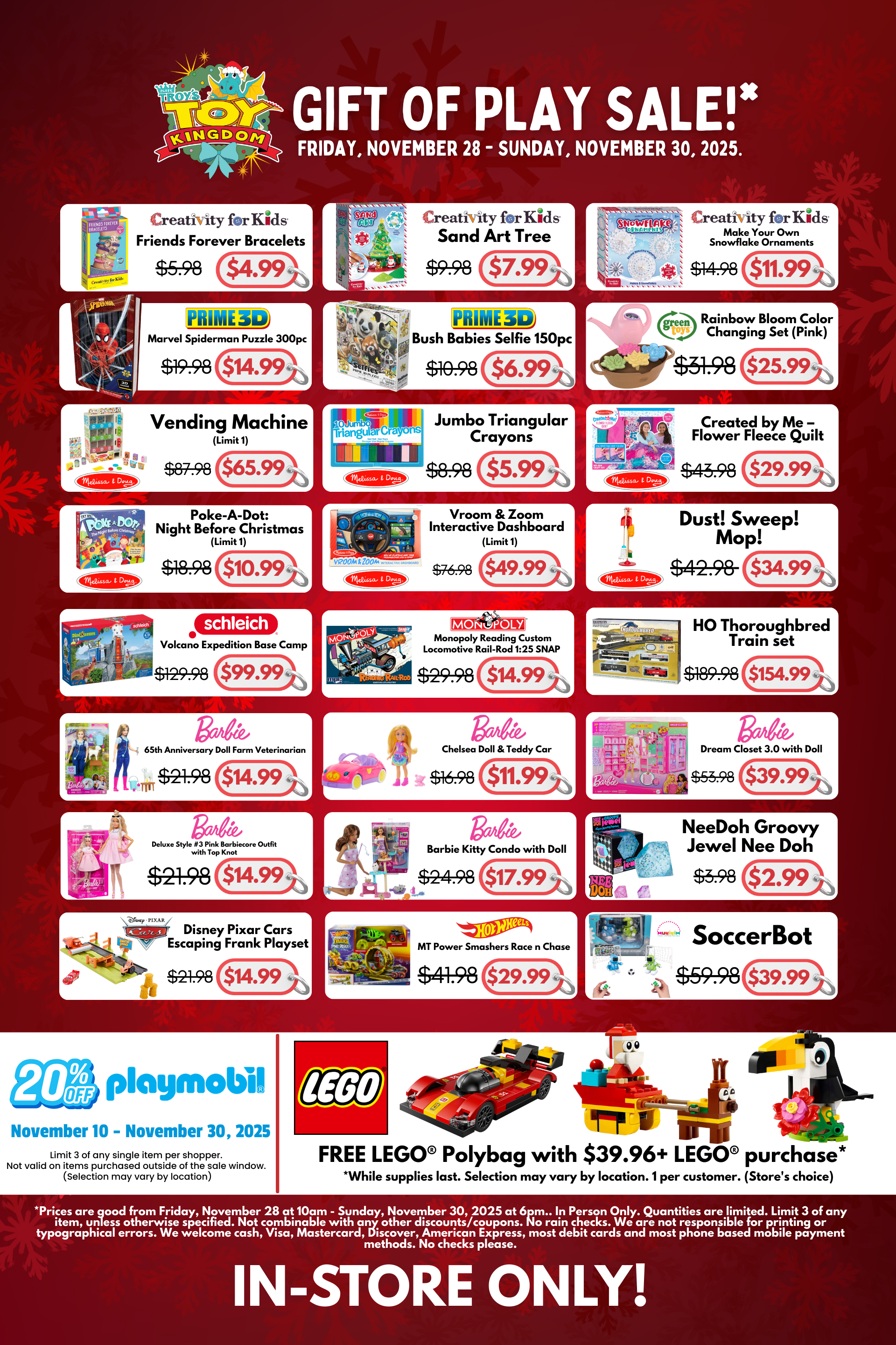 *Prices are good from Friday, November 28 at 10am - Sunday, November 30, 2025 at 6pm.. In Person Only. Quantities are limited. Limit 3 of any item, unless otherwise specified. Not combinable with any other discounts/coupons. No rain checks. We are not responsible for printing or typographical errors. We welcome cash, Visa, Mastercard, Discover, American Express, most debit cards and most phone based mobile payment methods. No checks please.