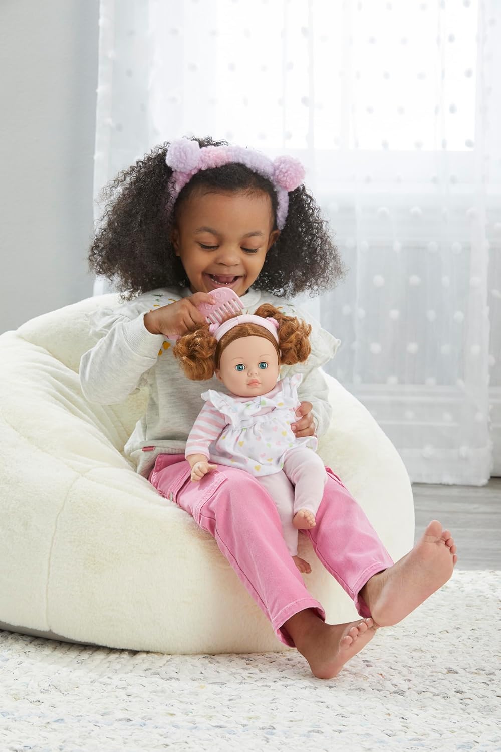 This adorable toddler doll is ready to be your child’s special friend! My Little Girl has a soft body, a weighted bottom and molded head, legs, and arms so it feels so real to your child! Her hair is in charming curly pigtails, with a knotted pink headband. The baby’s gently smiling face has sleep eyes, facilitating bedtime play. She comes dressed in sweet polka dot pinafore, long sleeve tee, and pink leggings. The doll features light skin, tosca hair and blue eyes. This doll comes with a comb and a brush. Ages 2+.