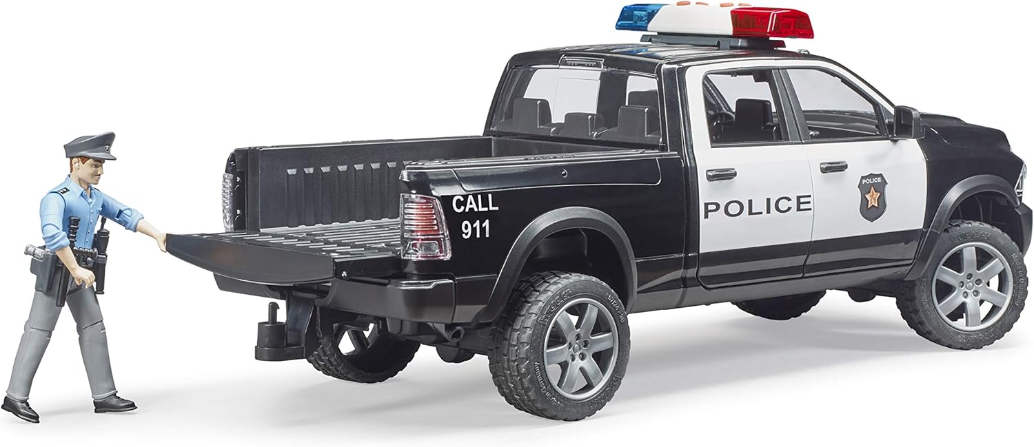 The emergency vehicle is based on the well-known RAM 2500 and as is common in the USA, has an attractive, eye-catching color scheme and a light and sound module mounted on the roof. Like its larger counterpart, the toy is equipped with the 4-door cabin, the Crew Cab. All doors can be opened and offer space for 4 bworld figures. For driving comfort and off-road capability, this 1:16 scale model is equipped with sprung axles, with the front axle being steerable using the included steering wheel extension. The tailgate can be opened for transport during play. The policeman included is well equipped and prepared for a variety of possible missions. From the wide range of emergency vehicles and figures, the bworld police station (item no. 62732) and the Jeep Rubicon Unlimited as a police vehicle (item no. 02526) are particularly well suited.